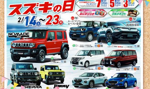 開催期間:2026年2月14日(日)~23日(月) ご成約特典!スズキ純正オプションプレゼント! 期間中小型車(新車)ご成約で「スズキ純正オプション7万円分(税込)」 ※ジムニーシエラ、フロンクス、ジムニーノマド、eビタ…
