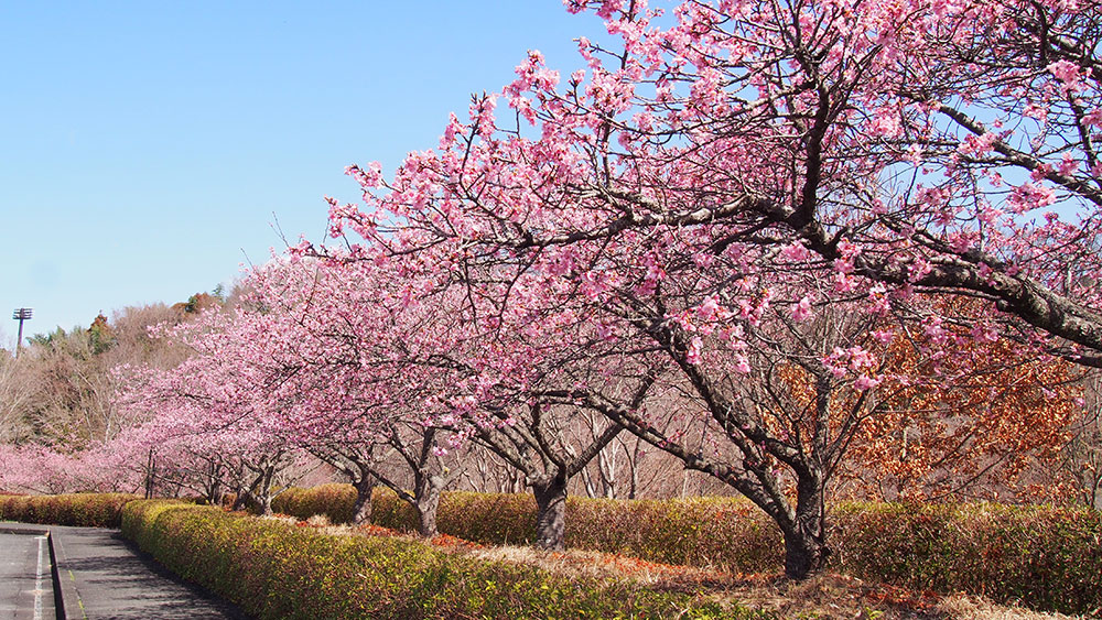2月中旬からは約360本の河津桜が斜面をピンク色に彩り、一足早い春を見に訪れる花見客でにぎわいます。
