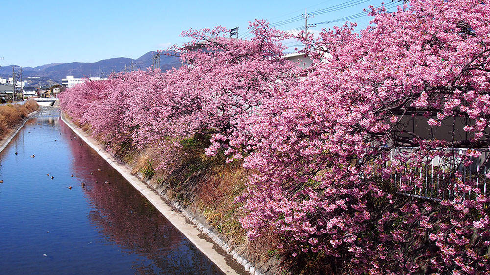 南足柄市体育センター近くにある洞川堤防はのどかな雰囲気の遊歩道。約30本の河津桜が2月下旬~3月上旬頃満開となります。