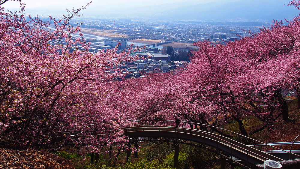 2月中旬からは約360本の河津桜が斜面をピンク色に彩り、一足早い春を見に訪れる花見客でにぎわいます。